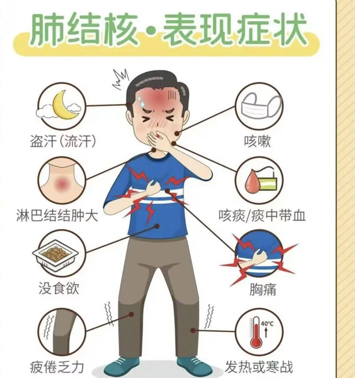 4.肺结核:咳嗽、咳痰(持续2周以上),胸闷、午后低热、食欲减退、盗汗等。