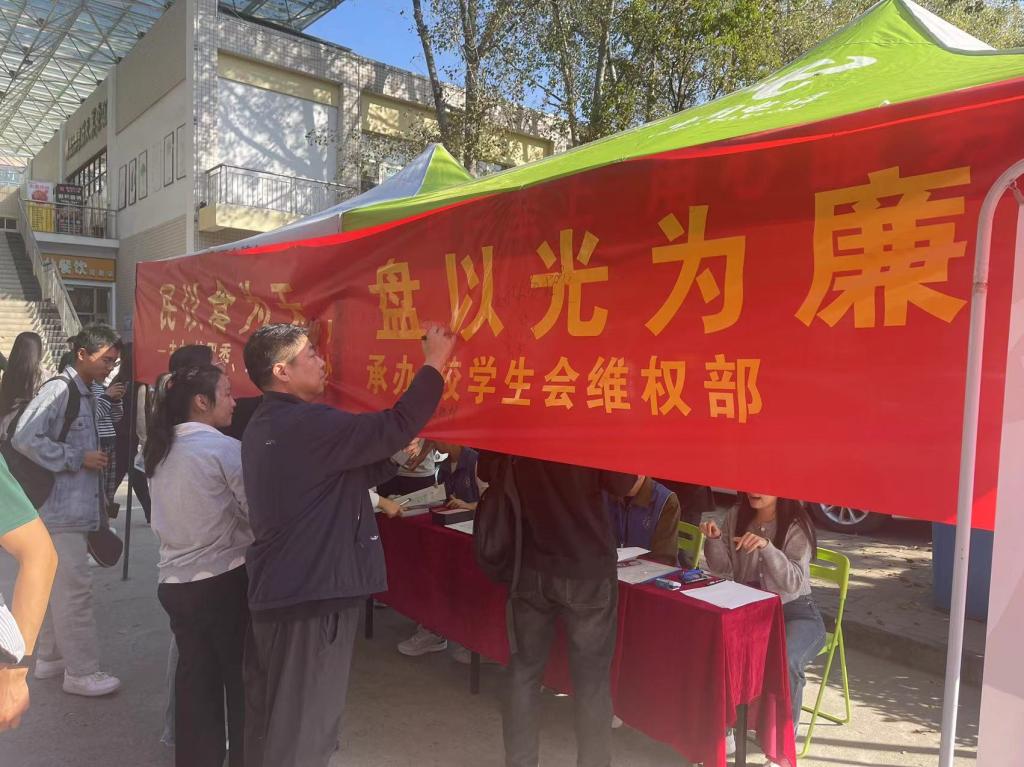 活动中,由校学生会维权部学生组成的文明餐桌志愿者服务者在为天食府前拉起了横幅,支起宣传海报,一面向过往的学子宣传“光盘行动”的意义,一面号召学子们在承诺条幅上签下名字,做到将勤俭节约的传统美德内化于心,外化于行。学子们纷纷表示,签下的不仅仅是名字,更是一份承诺,是一份与粮食浪费作斗争、争做光盘行动践行者的承诺。本次活动还利用线上小程序“光盘打卡”,通过有奖打卡的形式,吸引更多学子参与到“光盘行动”中来。