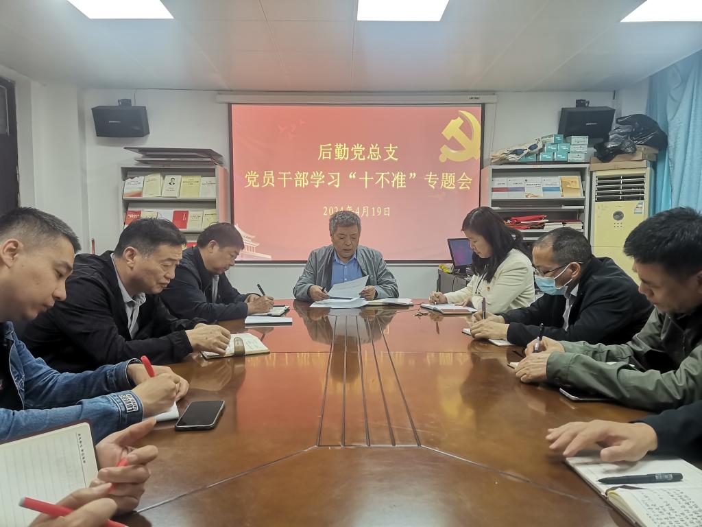 4月19日下午,后勤党总支在后勤楼105会议室开展学习“十不准”党风廉政建设专题学习会,会议由后勤党总支副书记赵文涛主持,总支委员及支委成员参加会议。