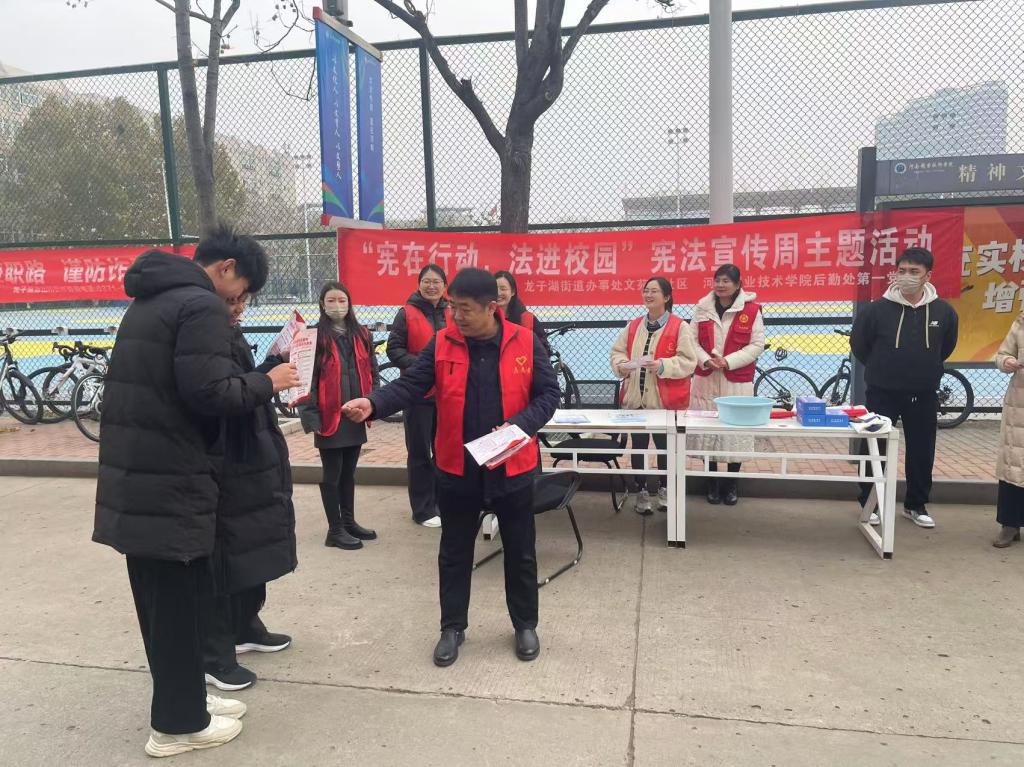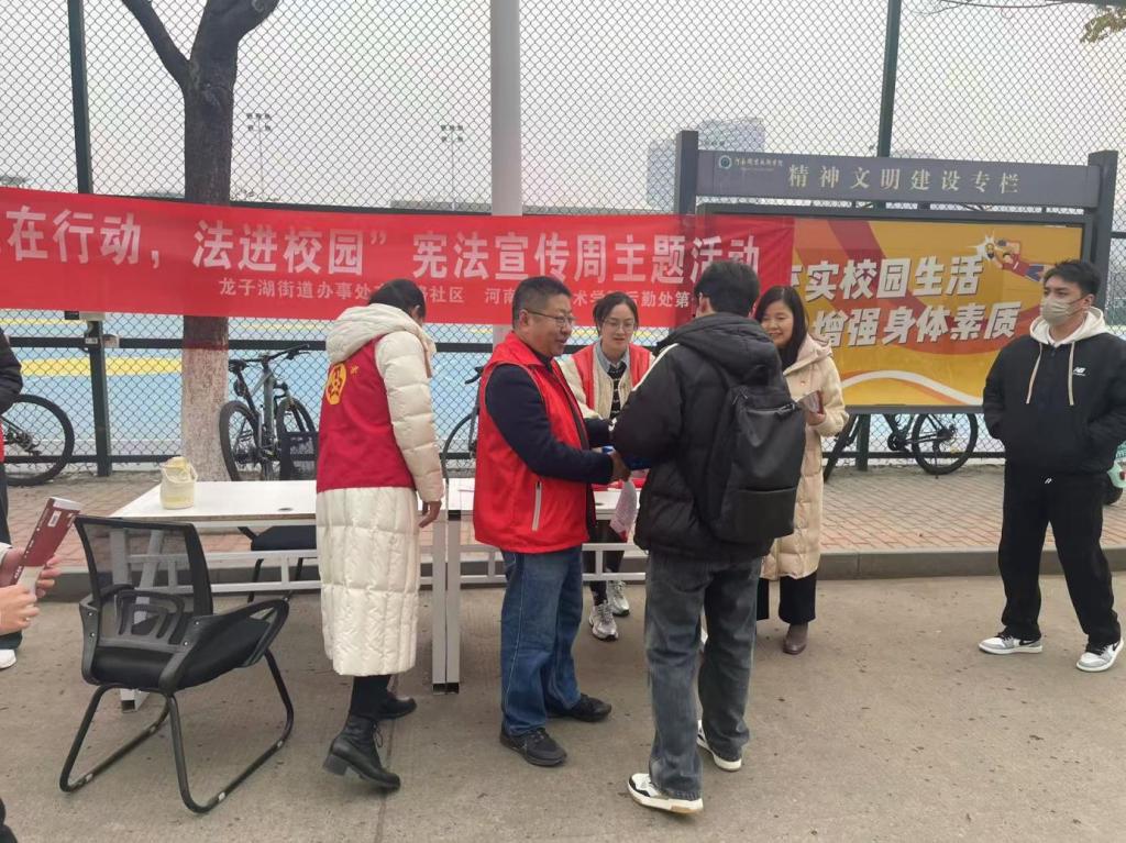 12月4日是我国的第十一个国家宪法日,当天上午,后勤党总支与龙子湖街道文苑路社区党支部深入校园,举办了“宪在行动,法进校园”的宪法宣传周主题党建活动,旨在弘扬宪法精神,维护宪法权威,营造法制社会氛围。