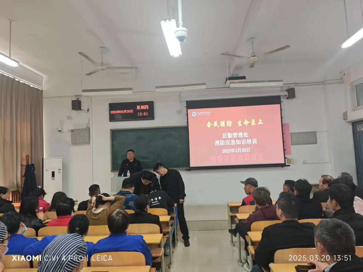 安全教育培训阶段采用“线上+线下”相结合的方式推进。3月18日上午,组织全体后勤员工集中收看教育部全国高校消防安全公开课,系统学习消防法规与基础理论。3月20日中午,特邀郑州市消防救援支队郑东新区大队宣传员、河南消防宣传之星党龙伟开展重点人群专场培训,全校餐饮、物业、商超、快递等服务单位180余名工作人员参训。培训通过理论授课与案例剖析相结合的形式,重点强化餐饮后厨防火、电气火灾预防、消防器材使用方法等技能,深入解析油烟管道积油、焊接火花防护、快递仓储管理等典型风险案例,有效提升了重点岗位人员的安全处置能力。